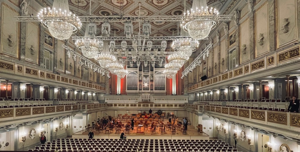 Assoziationen, Gedanken, flüchtige Beobachtungen, aus der Beklemmung heraus. Grauschöpfe im Parkett, Orgelpfeifen in Reih und Glied, Lüster, ganz brav ohne n, weiße Scheinwerfer wie bei der Rückkehr der Jedi-Ritter, zwei dorische Säulen (wenn die Dorer das wüssten). Schmale Säulen auch links und rechts unter den Seitengalerien, metallen, vergoldet, baulich wohl nutzlos, à la Mississippiraddampfer. Preisfrage: Gibt es noch einen Fluss, der drei Doppelbuchstaben im Namen hat?