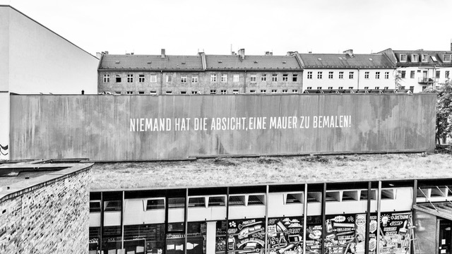 Wir laufen die Mauermeile ab, schauen uns an, wo früher mal der „antifaschistische Schutzwall“ stand. Für die Touristen hat man den einstigen Verlauf mit einem Pflastersteinband (Beginn der Todeszone), drei bis vier Meter hohen Stahlstreben (die Mauer an sich) sowie gelegentlichen, noch höheren Wachturmattrappen markiert. Dazwischen Fotos aus der Zeit, Infotafeln und sogar kleine Audioguide-Stationen, wo man sich auf deutsch oder in English anhören kann, wie furchtbar das alles einmal war.